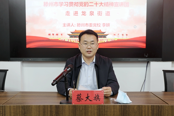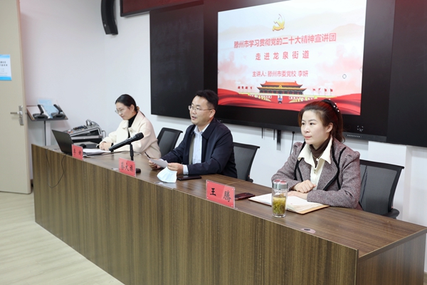 为不断增强学习宣传贯彻党的二十大精神的政治自觉、思想自觉和行动自觉,努力在深学细悟、真知笃行上持续用力,进一步提高站位,增强使命担当,12月9日下午,滕州市学习贯彻党的二十大精神宣讲团走进龙泉街道。市委党校教务处李妍主任应邀到街道进行宣讲;街道党工委副书记、政协委员联络室主任蔡大旗,党工委委员、宣传委员王腾,部分机关干部、片区工作人员参加活动。