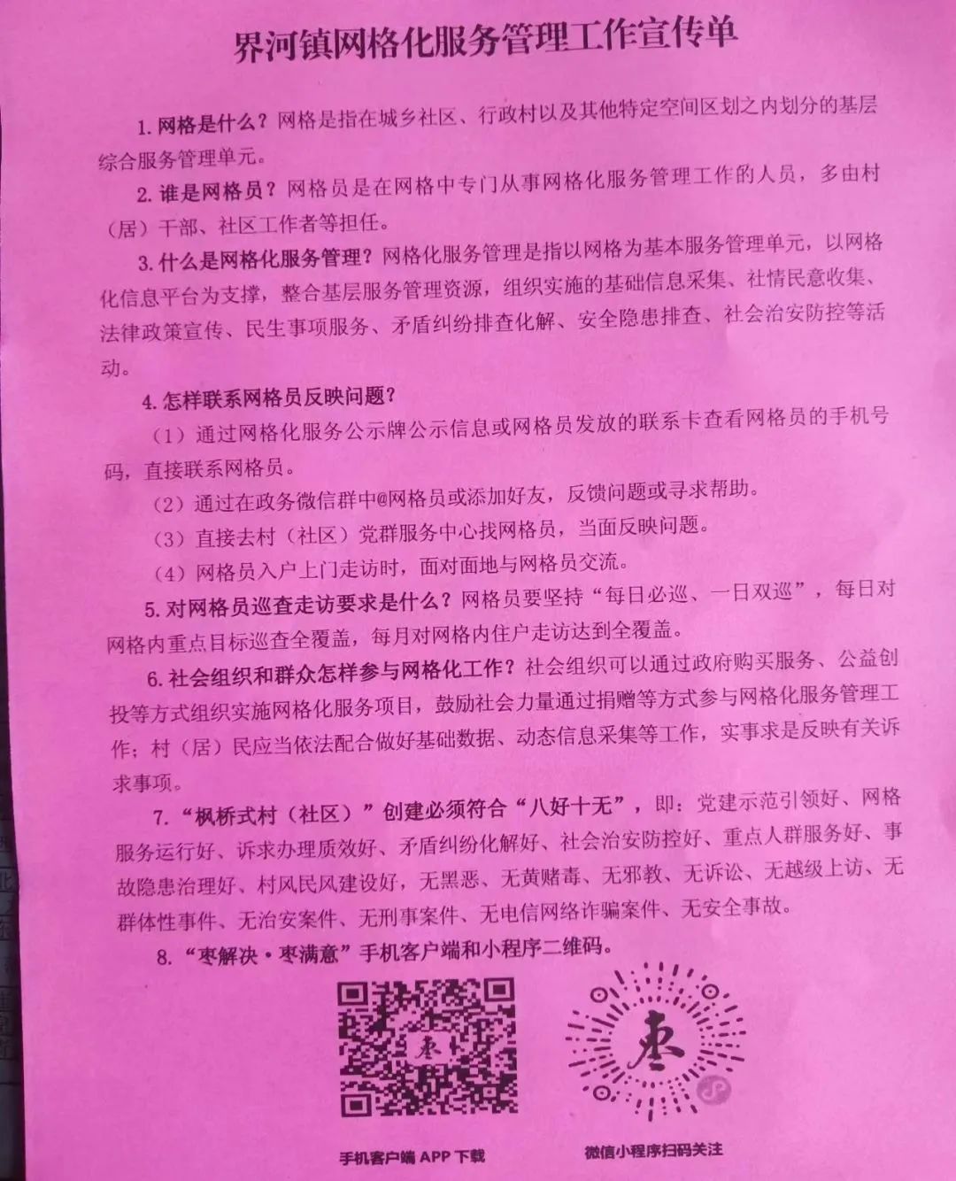 为提高网格化知晓率,界河镇为70个基础网格统一制作了网格公示牌,将网格公示牌张贴到村中醒目位置。公示牌内容明确了网格员的工作职责和联系方式,让群众明白“有事就找网格员”,使网格化工作更加便捷化、精细化。同时,为网格员配齐网格“7件套”,制作便民联系卡3.5万张,印制网格宣传资料2.5万份,让群众通过浏览公示牌、扫描联系卡、阅读宣传页,就能知晓网格政策知识、解决有关问题,使小事不出网格、大事不出村居。