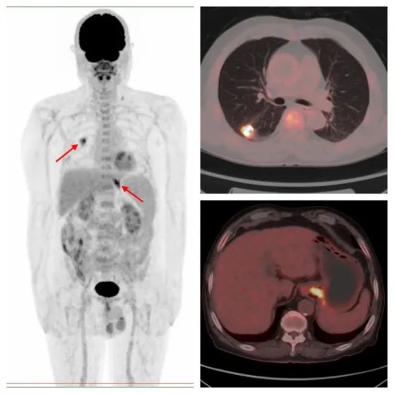病例1,PET/CT示右肺下叶、贲门代谢异常,符合双原发癌;之后患者行CT引导下肺部病变穿刺,病理证实原发肺腺癌,行胃镜下贲门病变活检,病理证实原发贲门腺癌。