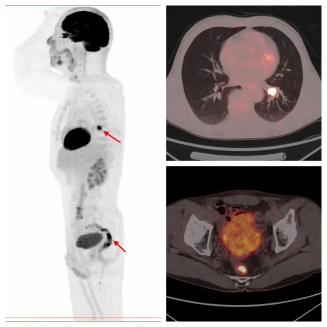 病例2,PET/CT示左肺下叶、直肠代谢异常,符合双原发癌;之后患者行支气管镜下活检,病理证实原发肺鳞癌;行肠镜下活检,病理证实为原发直肠溃疡型腺癌。