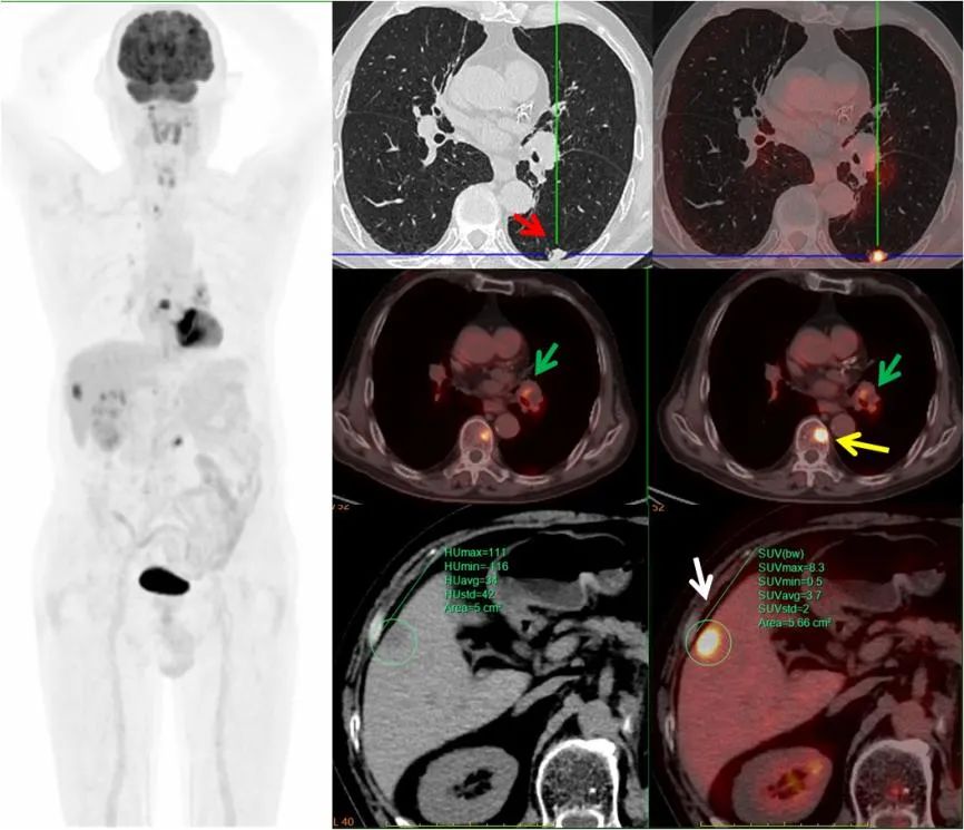 病例3,中年男性,左肾癌术后三个月,PET/CT示左肺下叶(红箭)、左肺门淋巴结(绿箭)、肝脏(白箭)、多发椎体(黄箭)高代谢灶,考虑左肺下叶原发MT可能,病理证实为小细胞神经内分泌癌。