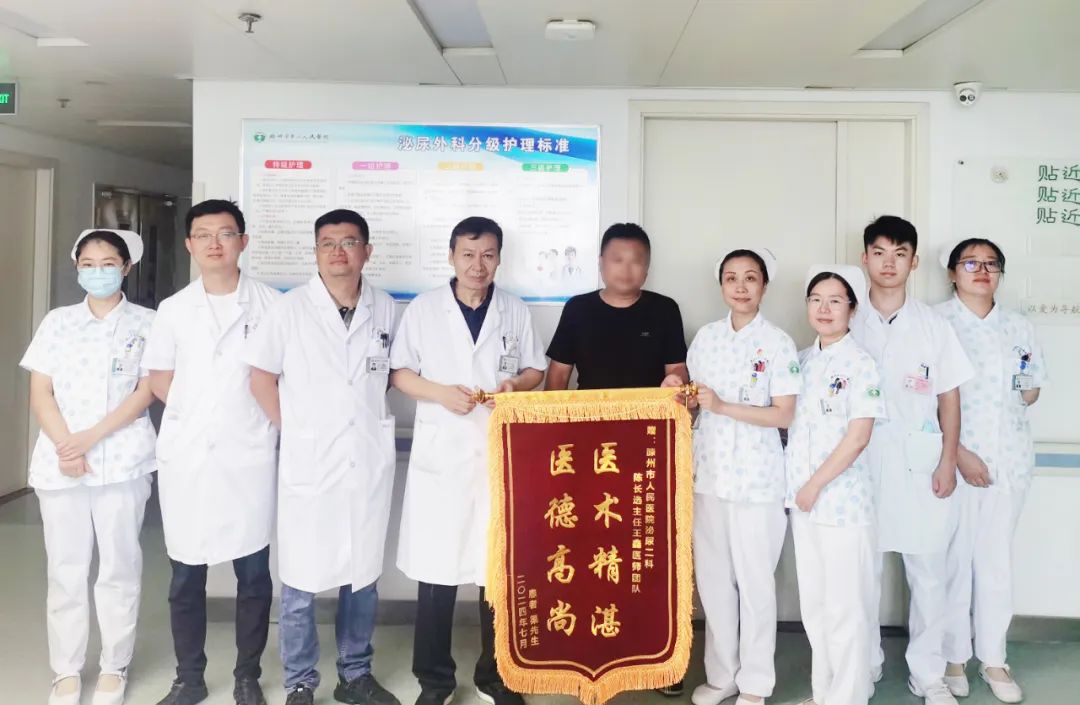 近日,我院泌尿外科二病区微创手术成功治疗一例复杂巨大肾肿瘤患者。患者对治疗效果非常满意,并赠送锦旗表示感谢。患者,男,65岁,查体发现右肾肿瘤,肿瘤巨大复杂,CT标识约14cm大小,与肝脏腹膜以及肠管等组织粘连严重。患者辗转枣庄市多家医院,均告知无法完成微创手术治疗。患者咨询了我院和北京多家医院后,决定来我院泌尿外科治疗。陈长选主任和王鑫主治医师,经过细致的病例讨论后,决定给予患者后腹腔镜下右肾肿瘤根治切除术。手术过程约两小时,术中无输血,切口约8cm,术后渗血少,愈合良好。术后7天,患者康复出院。巨大肾肿瘤,复杂粘连,尤其是右侧肾肿瘤的肾蒂血管处理难度很大,多数医院医生往往选择开放手术切除,切口约25~30cm,患者创伤较大。该患者微创手术的成功,彰显了我院泌尿外科在处理难度很大的,以及复杂巨大肾肿瘤方面的能力,达到了国家级手术水平。图文 / 泌尿外科二病区版式 / 刘 胜 张贤随责编 / 王 芳 徐 萌校对 / 赵 席审核 / 张延博转发,收藏,点赞,在看,安排一下?