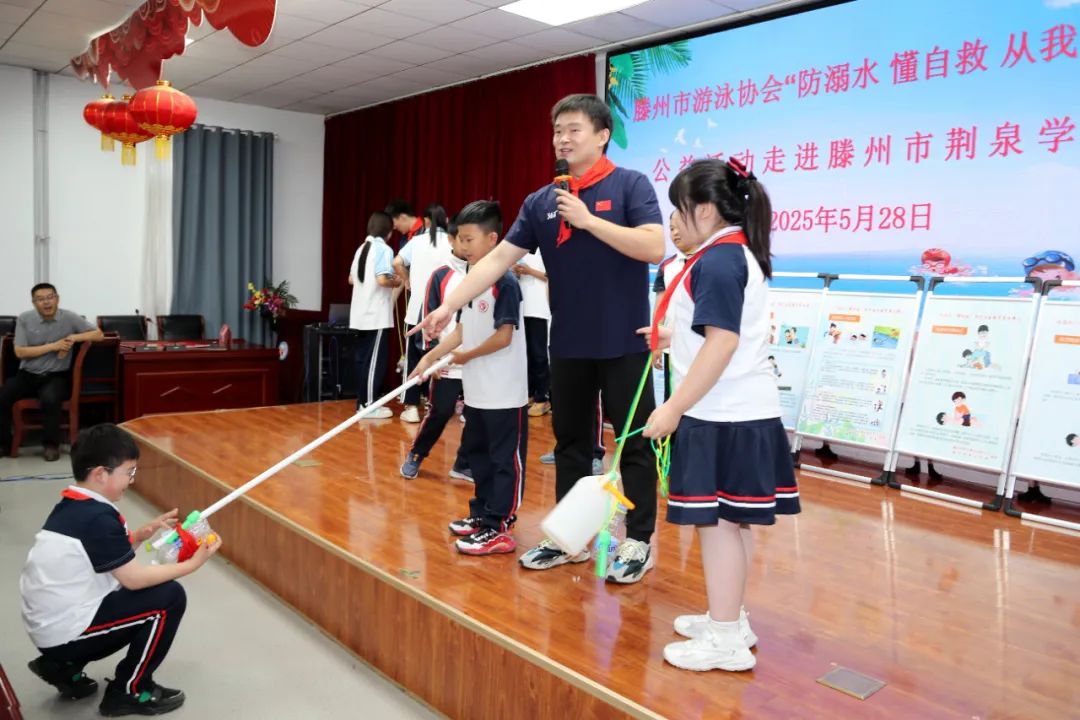 夏意渐浓,防溺水警钟长鸣。为筑牢青少年安全防线,增强学生防溺水意识与自救互救能力,5月28日上午,滕州市游泳协会“防溺水 懂自救 从我做起”公益活动走进荆泉学校,通过物资捐赠与沉浸式教学相结合的方式开展安全教育活动。市体育事业发展中心党组成员、副主任,市体育总会秘书处秘书长杨水山,市游泳协会主席韩伟等出席活动,与该校师生共同见证这场别开生面的生命教育课。