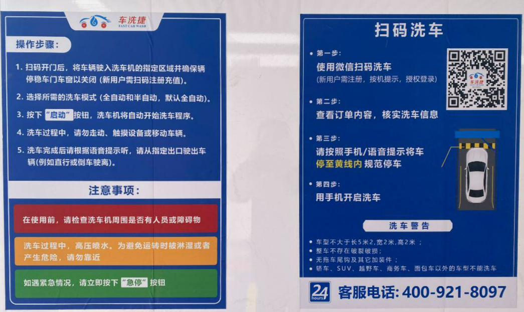 服务安全规范,全程保障无忧。为保障洗车过程顺利与安全,公司在洗车区域醒目位置张贴了清晰的操作指南与注意事项,明确车辆尺寸要求、规范操作流程及应急处理方式。同时,推出24小时客服热线,随时为车主提供操作指导、咨询与故障响应支持。设备运行期间,公司也将安排专职人员定期进行设备巡检与维护,确保系统持续稳定运行,持续提供高品质服务。