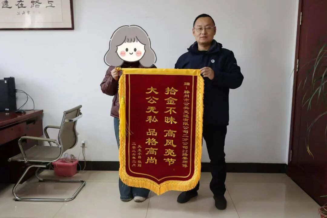 据悉,2月8日17时30分左右,吕女士从伤骨医院站点乘坐22路公交车出行,下车时因匆忙不慎将手提包遗落在座位上却未察觉。当驾驶员姜翔皓师傅完成该趟运营任务后,在站点对车厢例行检查时在车厢座位上发现了一个女士手提包,为能尽快查找失主信息,他立即打开包仔细清点物品,发现包内有现金一万七千元、身份证、社保卡、银行卡等贵重用品,面对这些贵重财物,姜师傅没有任何犹豫,立即将情况上报分公司值班人员并妥善保管物品,值班人员登记信息后迅速反馈给公司服务热线,以便及时寻找失主。次日上午,服务热线接到了失主吕女士的求助电话,得知物品已被驾驶员妥善保管后,张女士如释重负。随后,吕女士赶到分公司驻地接过失而复得的物品,激动不已,连声道谢。事后,吕女士特意制作了一面锦旗,对姜师傅拾金不昧的品德与公司高效负责的服务表示高度赞扬。